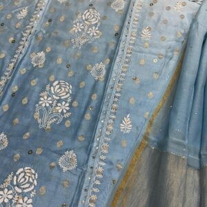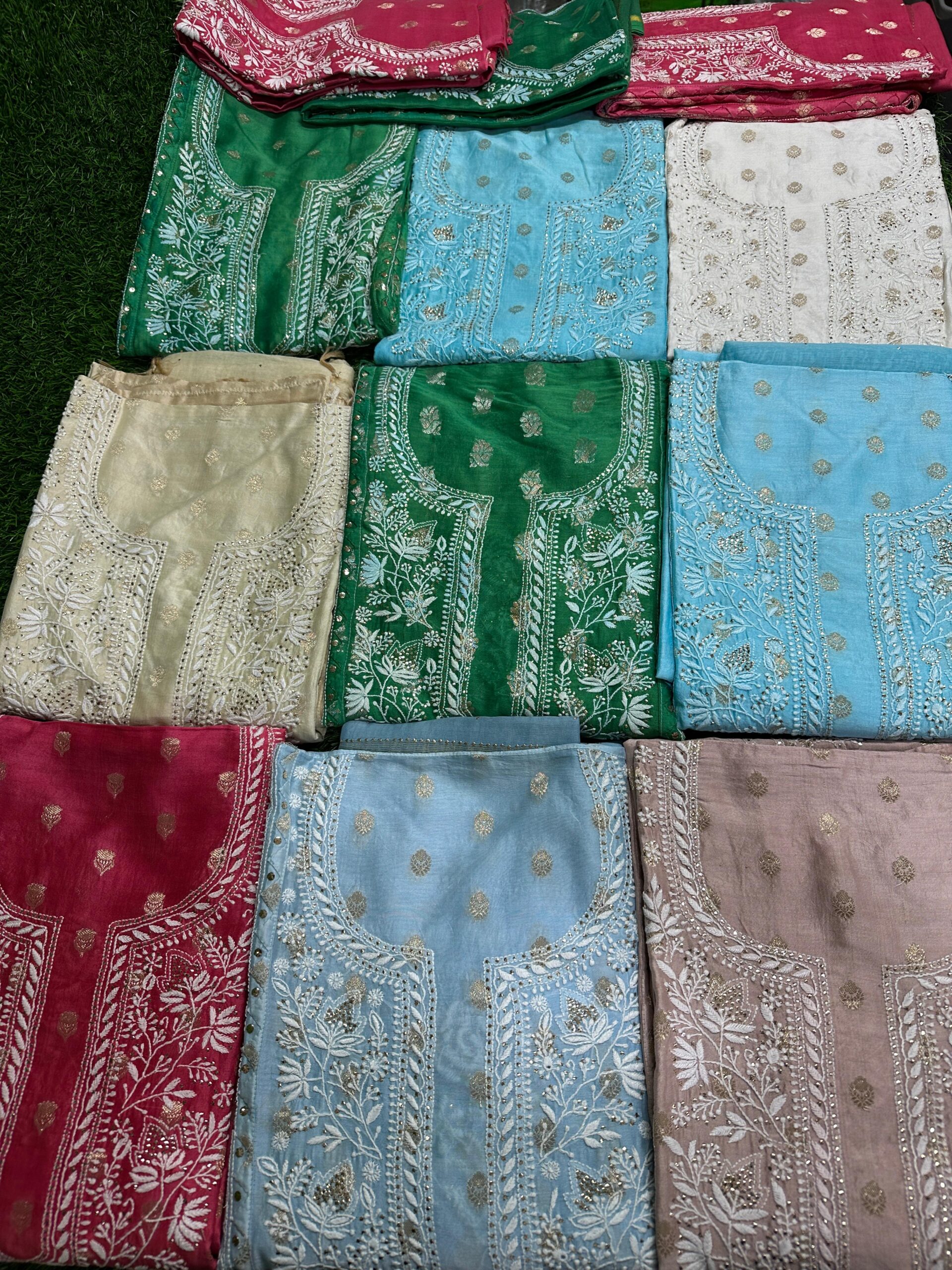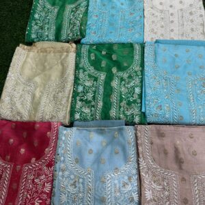 - Lucknowi Chikan Work: Intricate hand-embroidery with Bakhiya, Phanda, Keel Kangan, and Murri stitches.