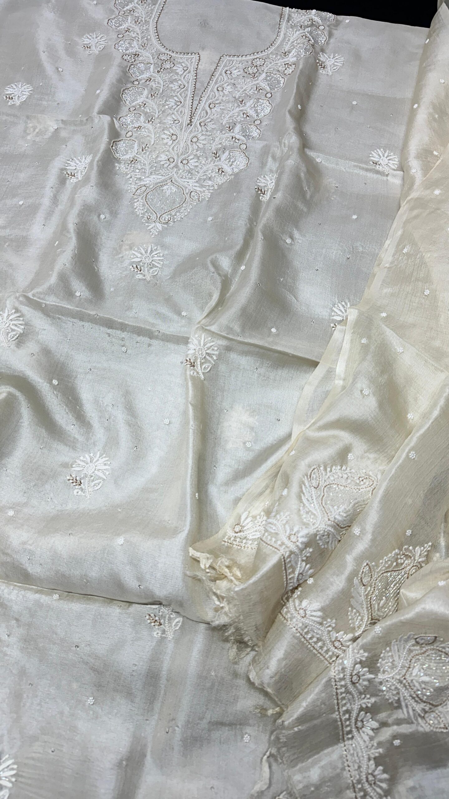 Katdana Work: Tiny glass beads sewn in patterns to add a subtle shimmer and texture.