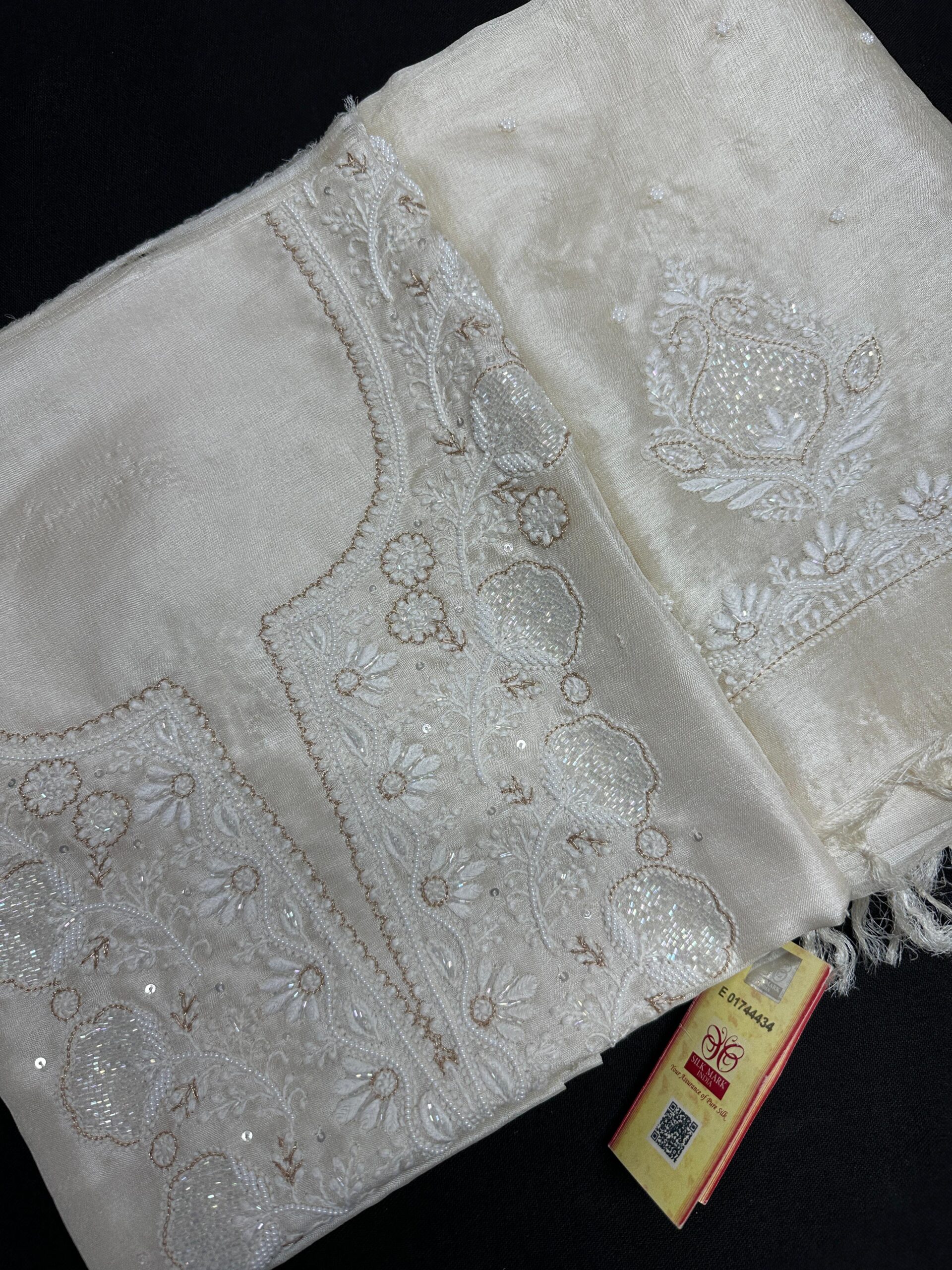 Pearl Work: Hand-attached pearl beads lend a soft, regal look.