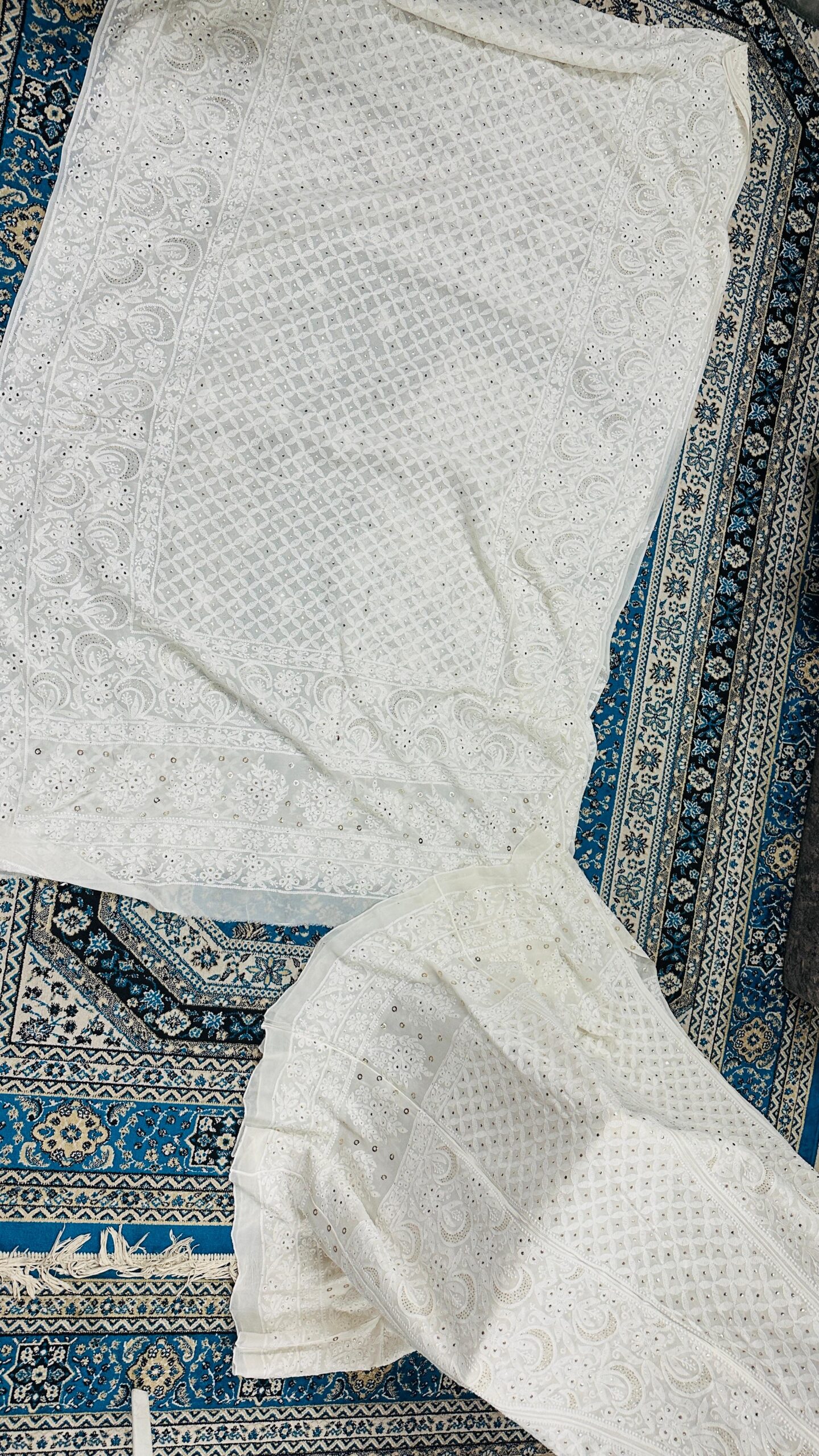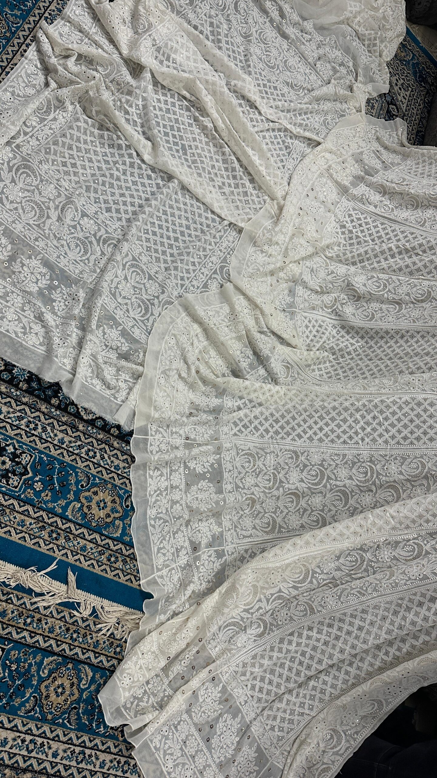 The blouse mirrors the Chikan and Mukesh work, creating visual continuity. Embroidery placement can be customized for neckline, sleeves, or back as per design preference.