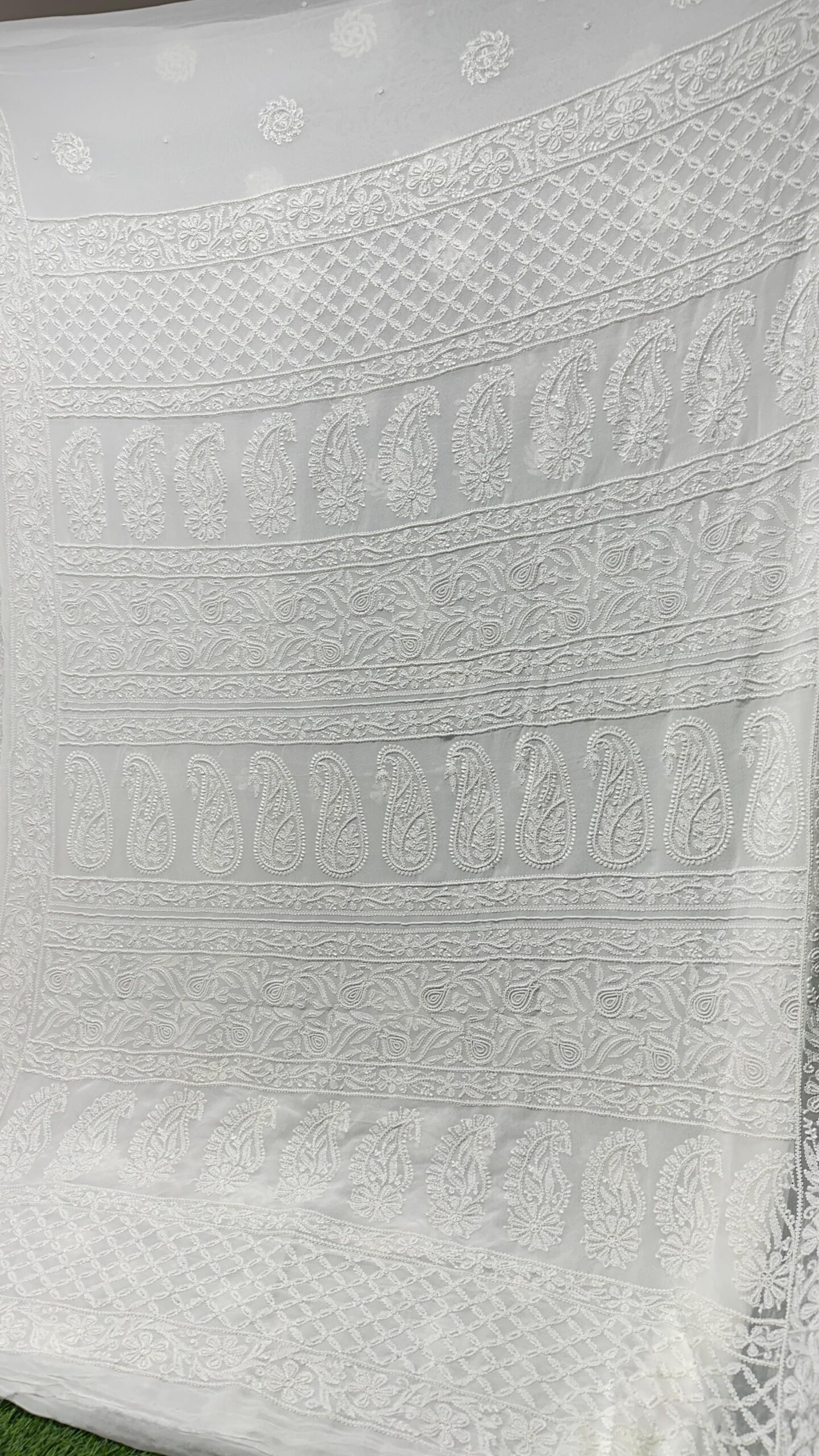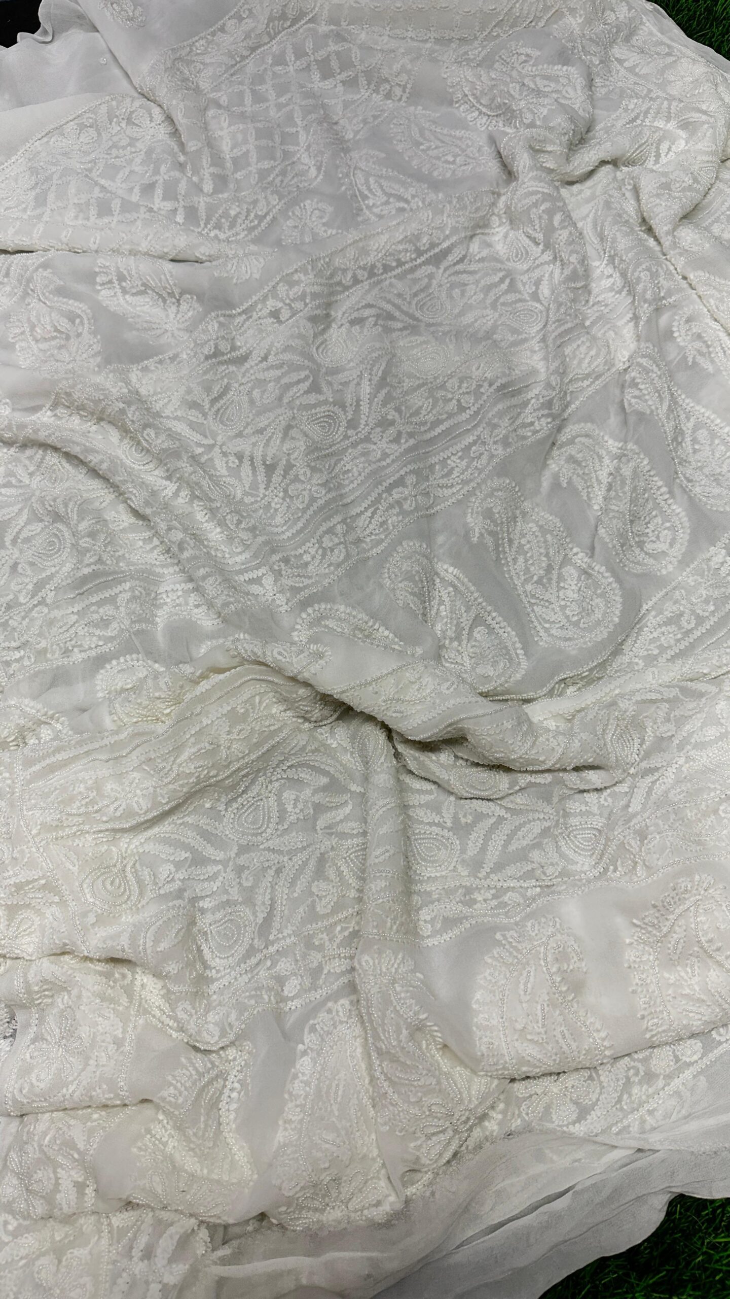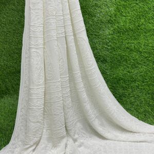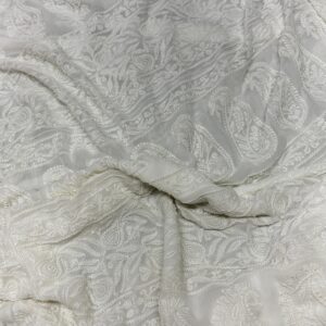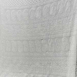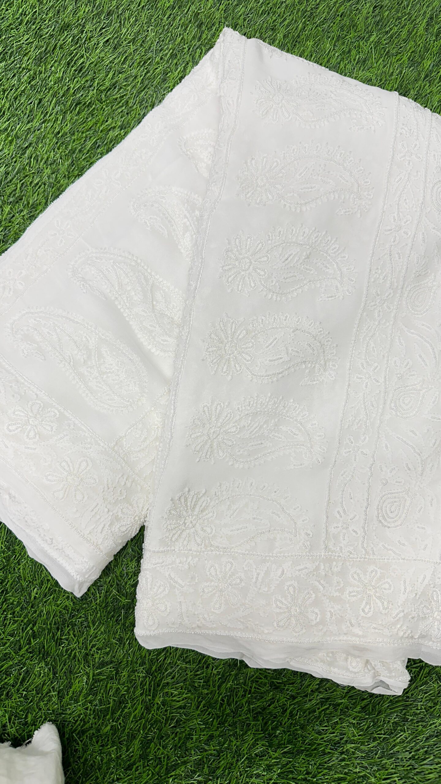 - Embroidery: Traditional Lucknowi Chikan work, known for its fine needlework and detailed floral patterns