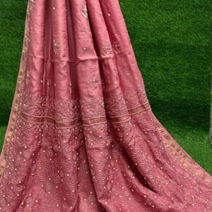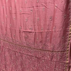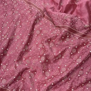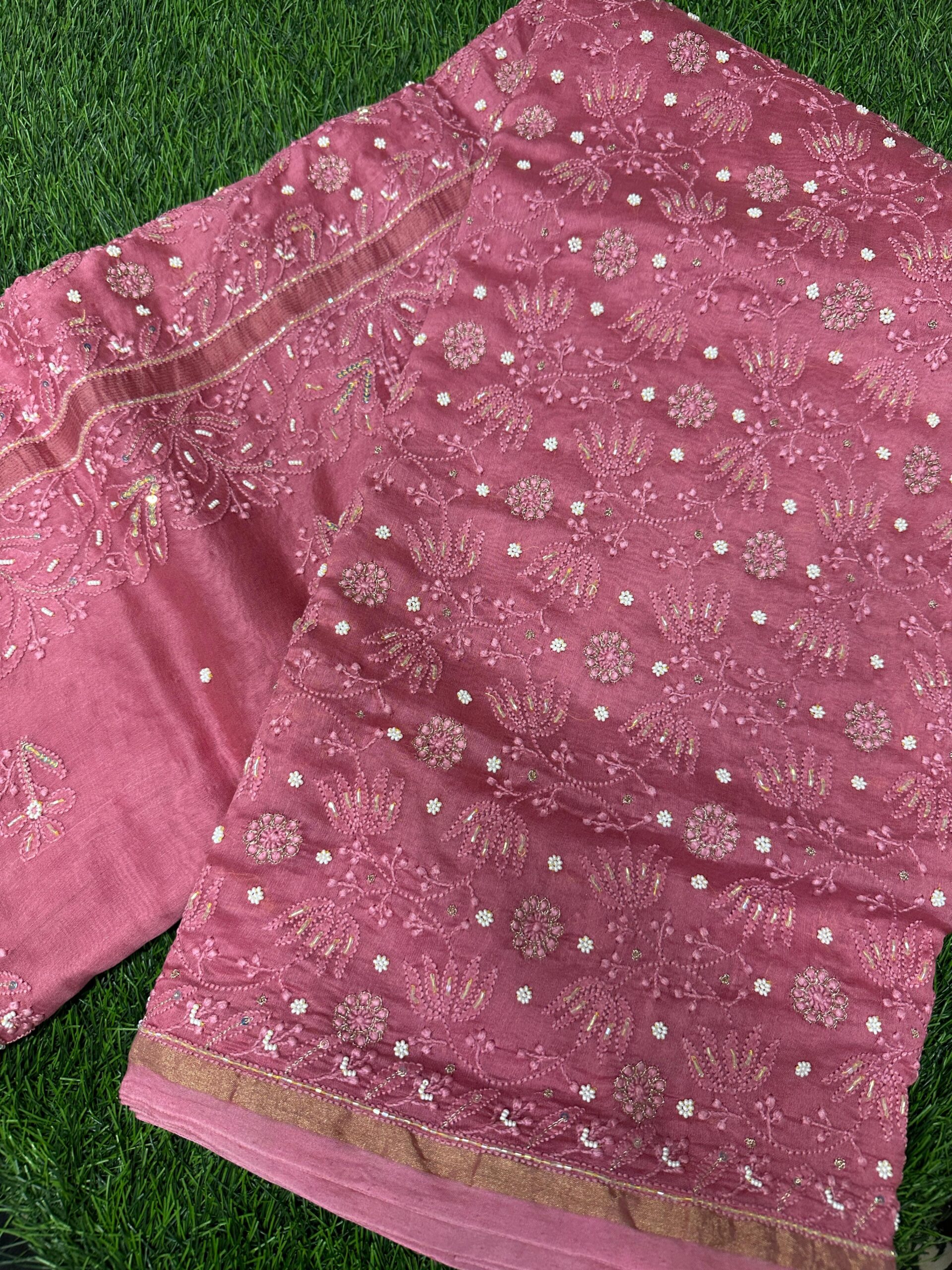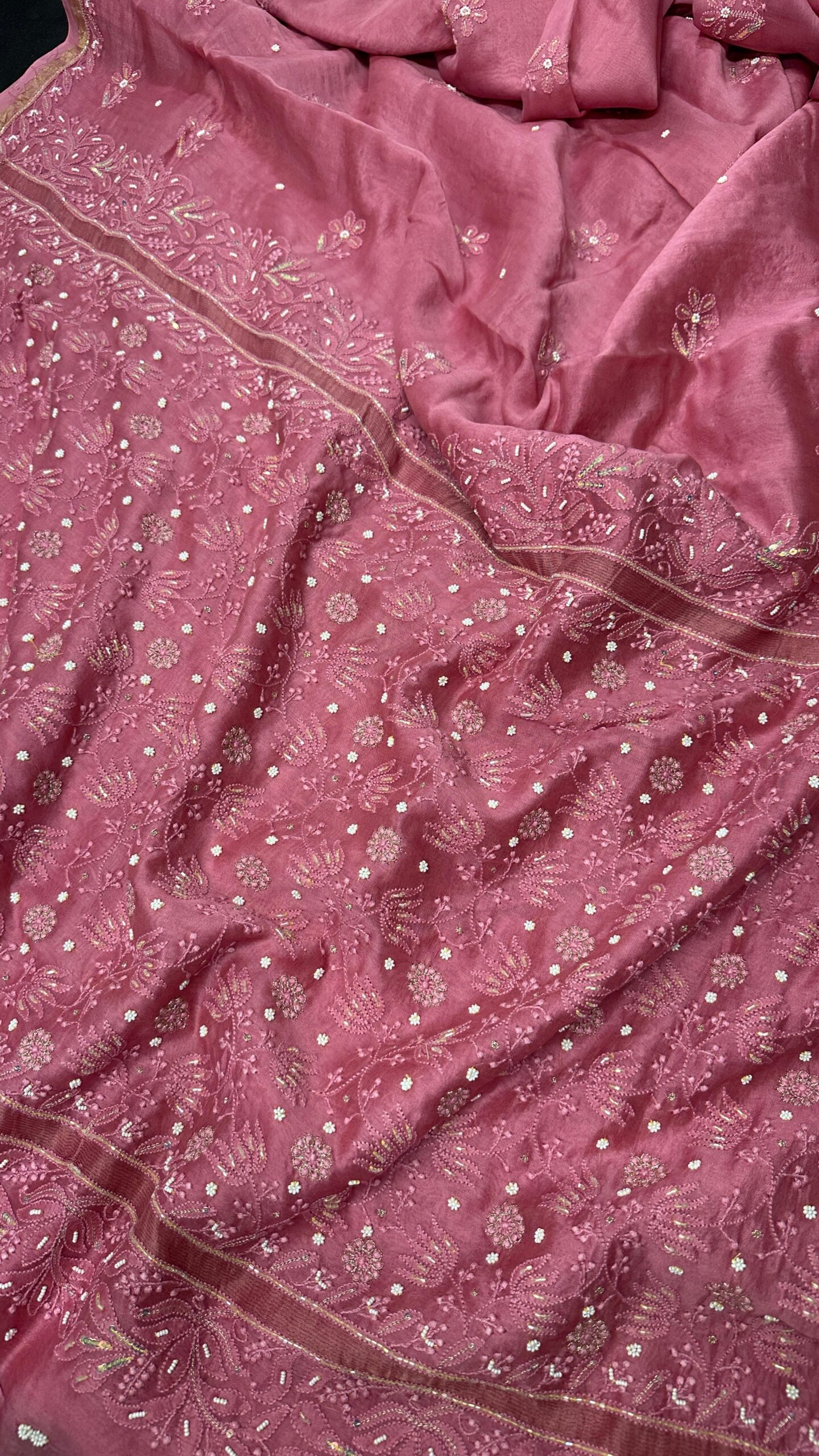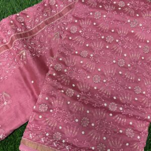 Grace meets tradition in this soft pure Chanderi silk saree, beautifully adorned with Lucknowi Chikan embroidery and detailed Katdana, Teeki, Pearl, and Pitta work.