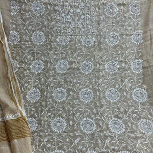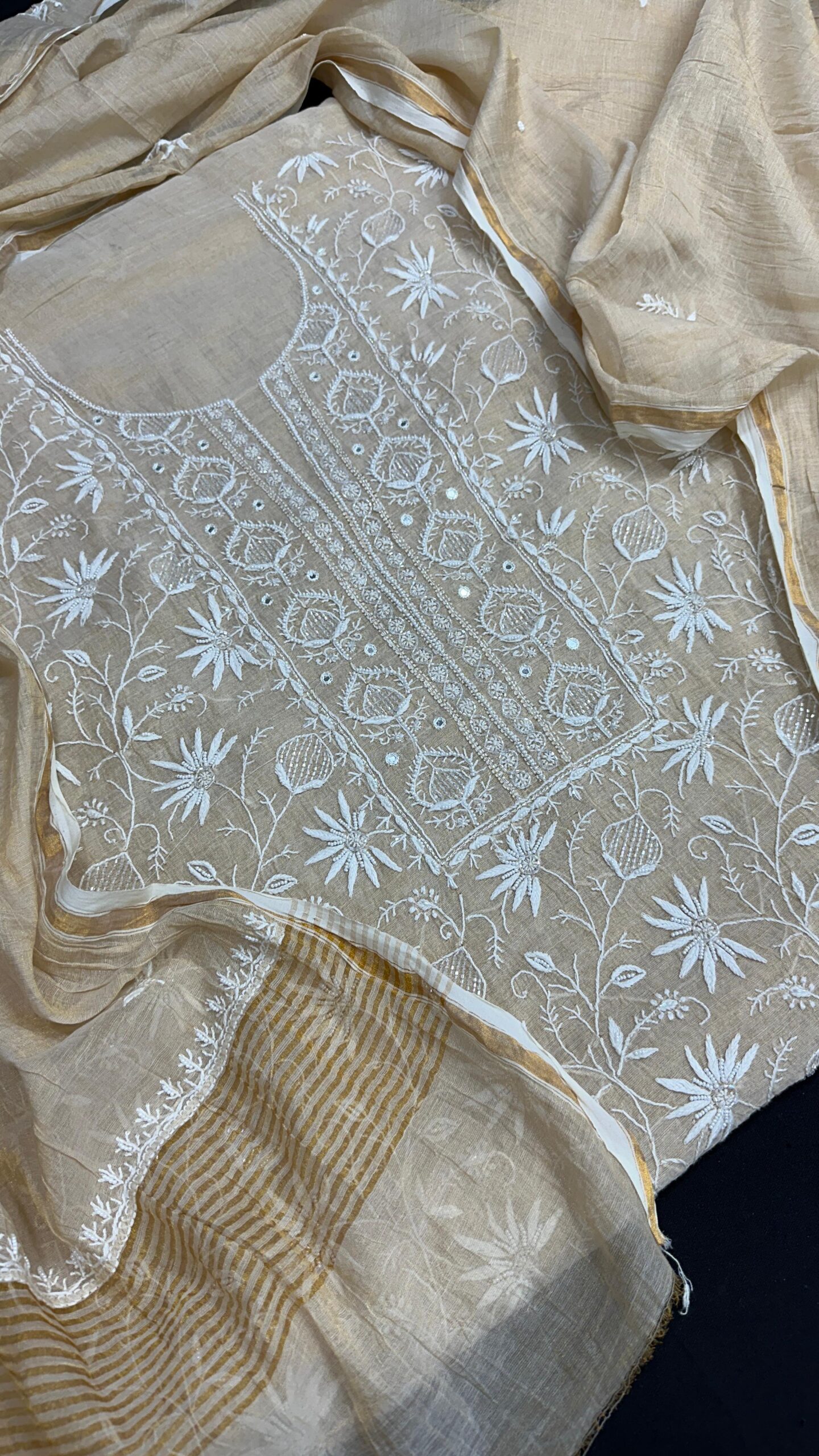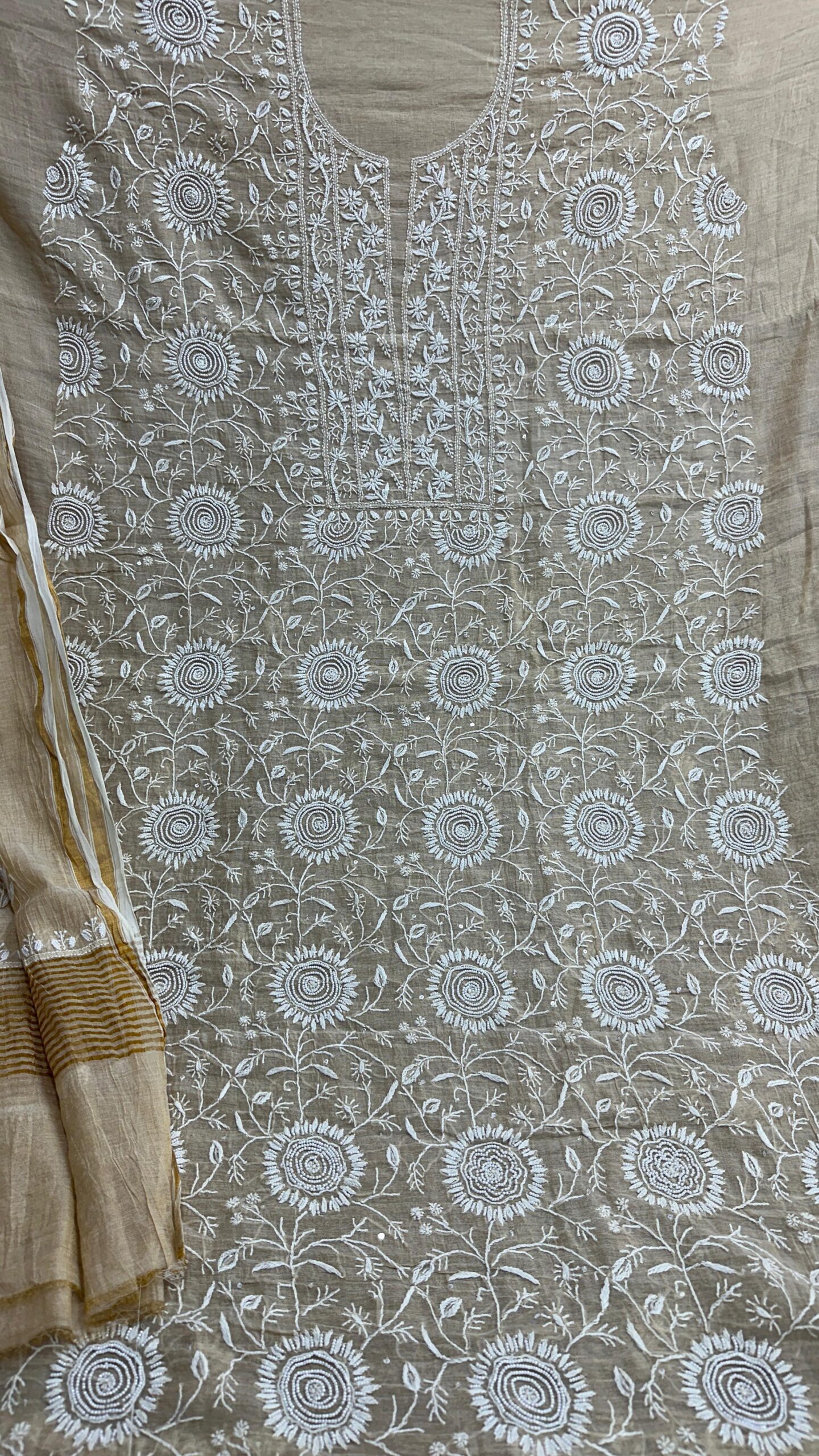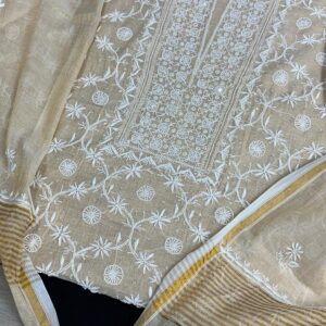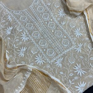 Technique: Traditional Chikan embroidery, originating from Lucknow, India, involves delicate hand-stitched patterns created using fine needlework.