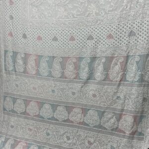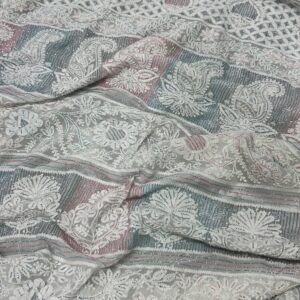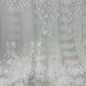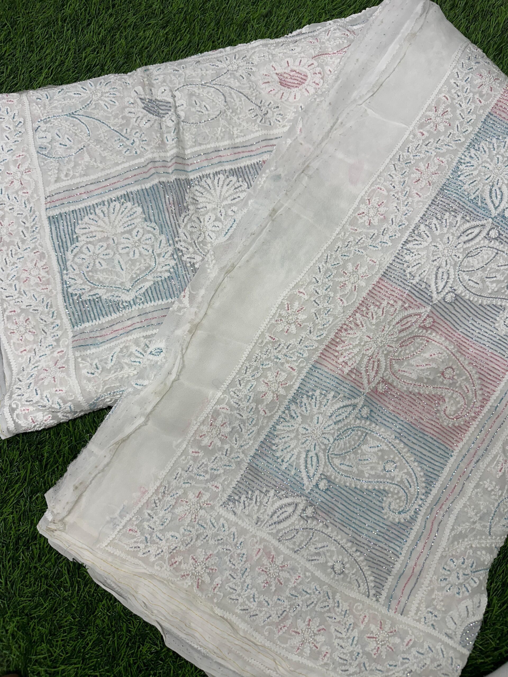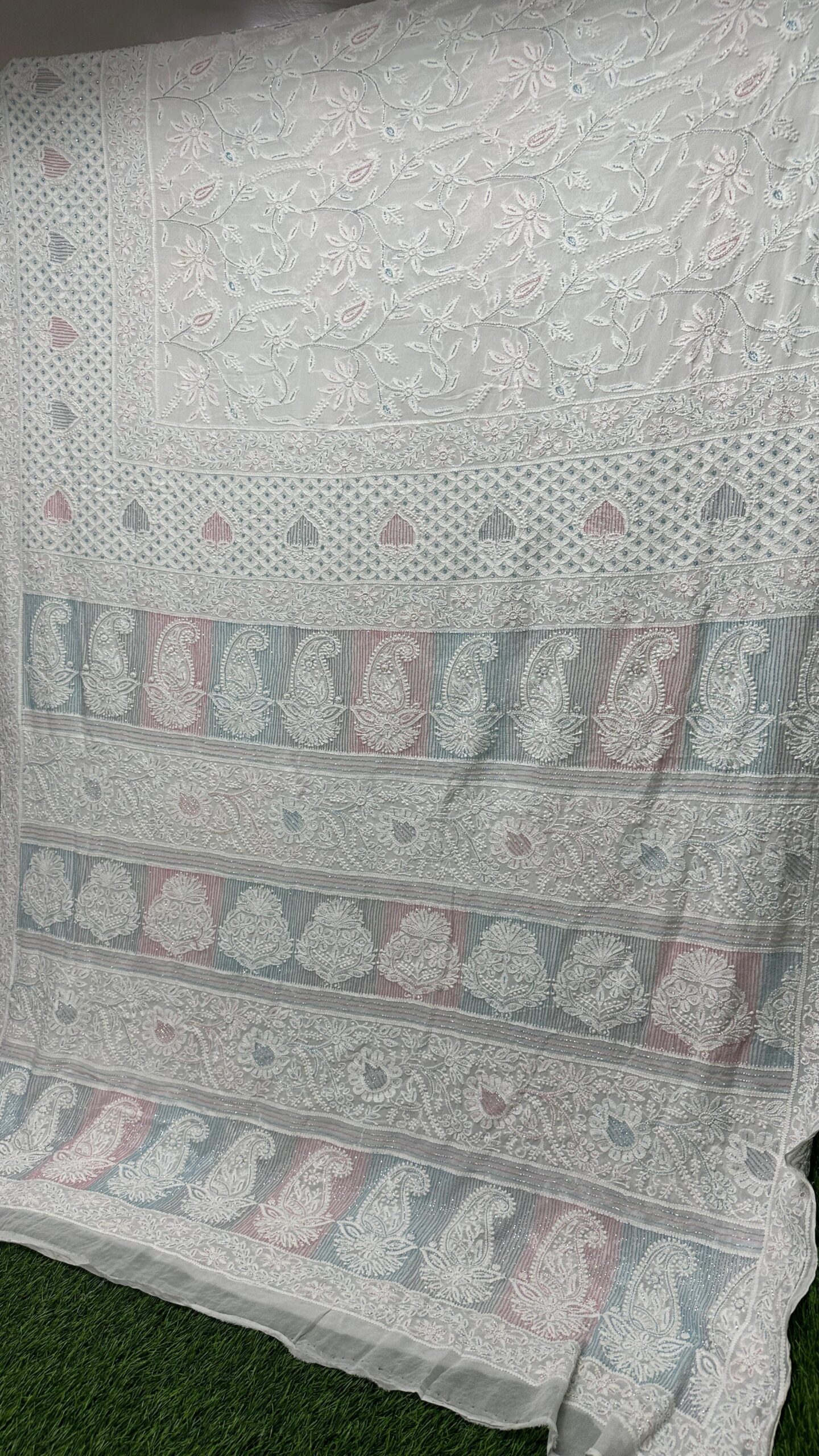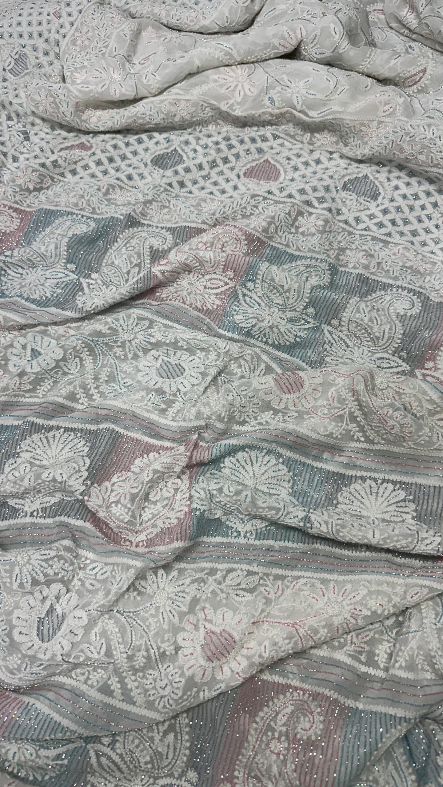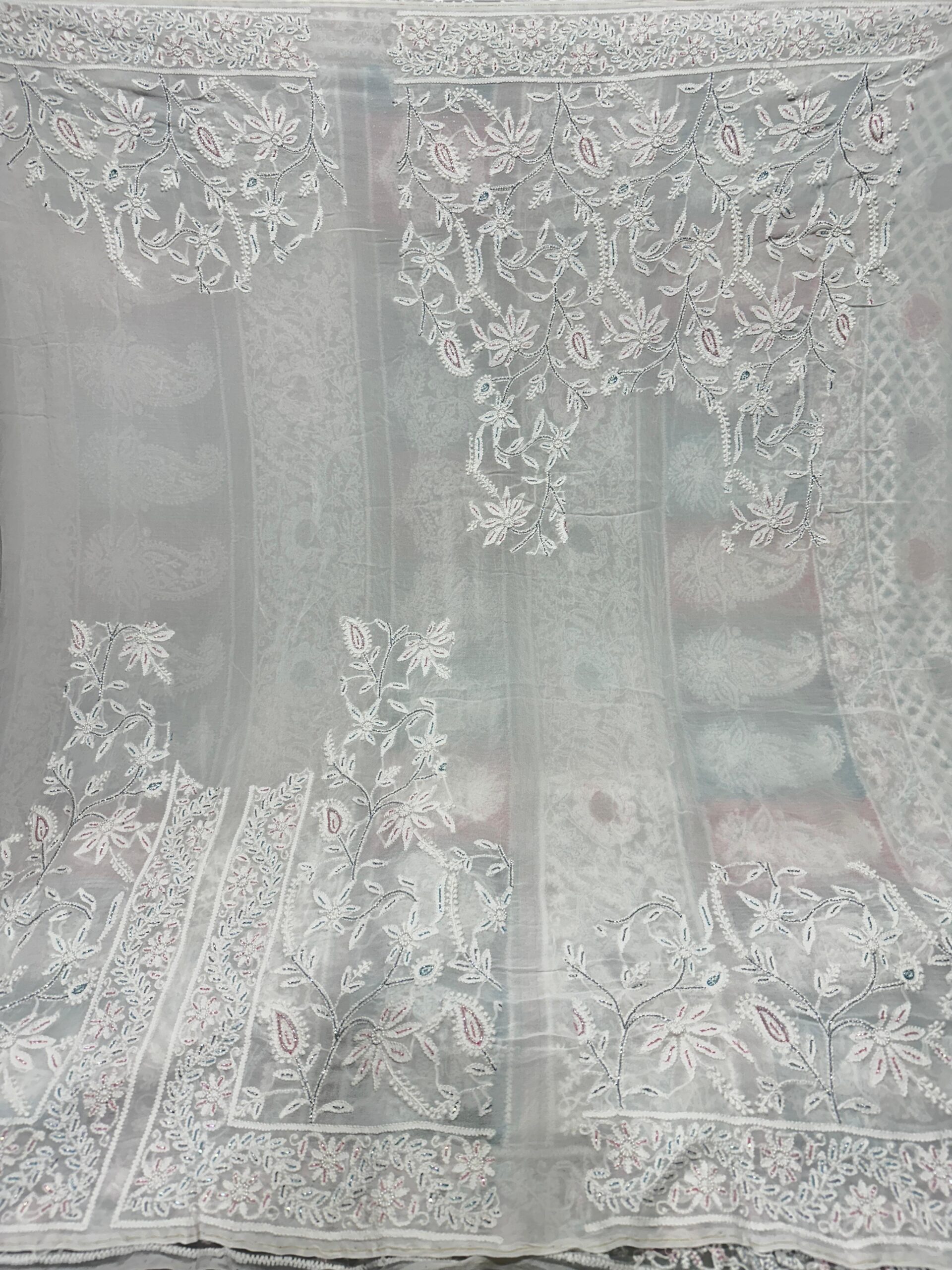 Elegant viscose georgette saree featuring intricate Lucknowi chikan embroidery with heavy jaal work, enhanced with katdana, teeki, pearl, and pitta detailing