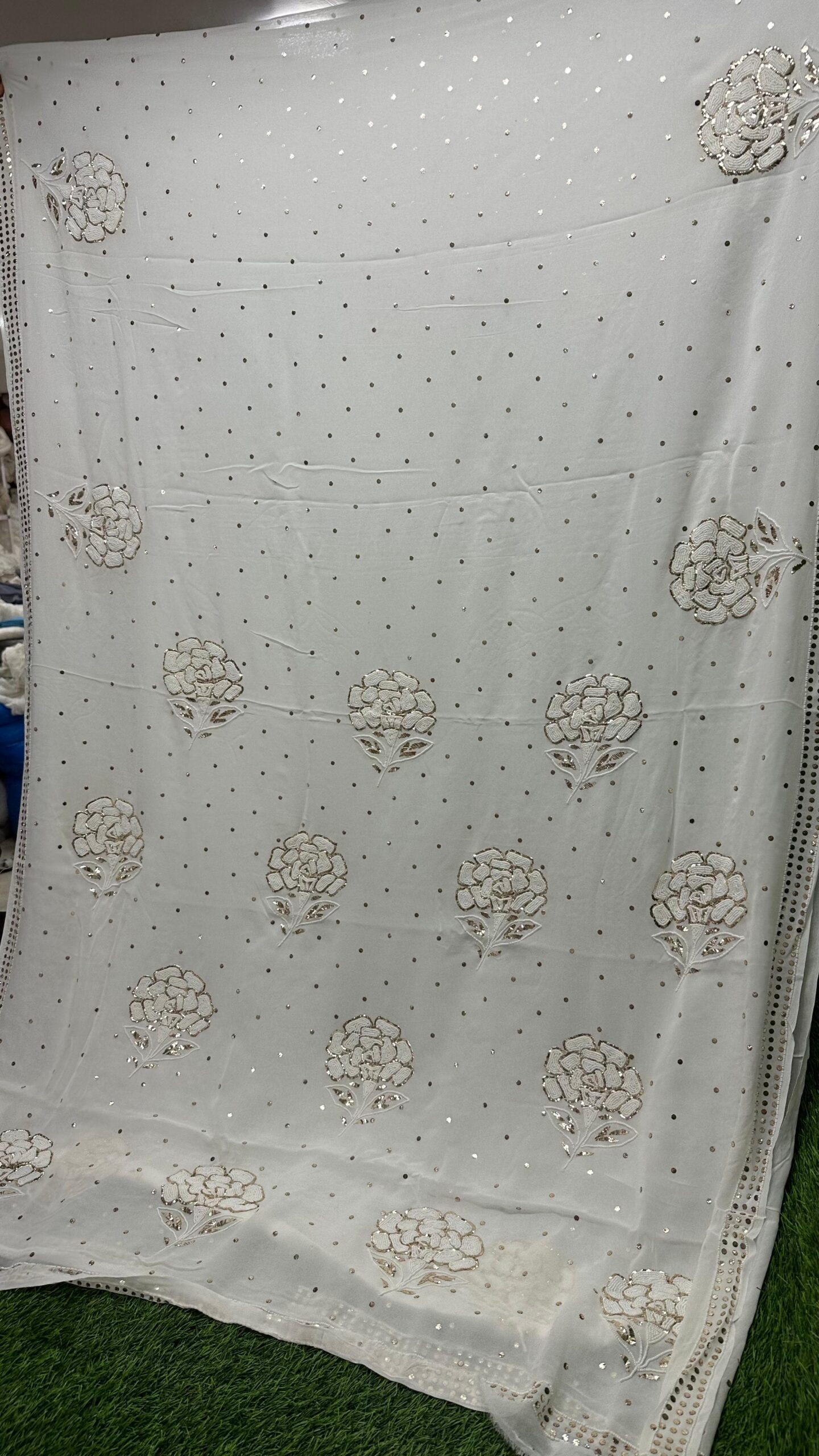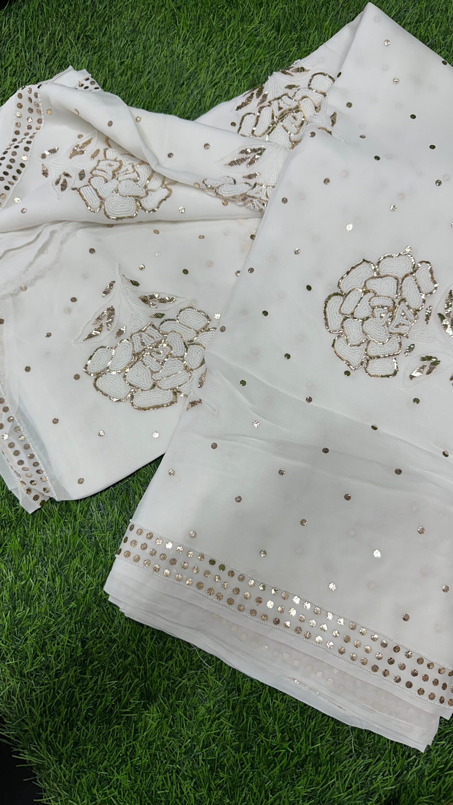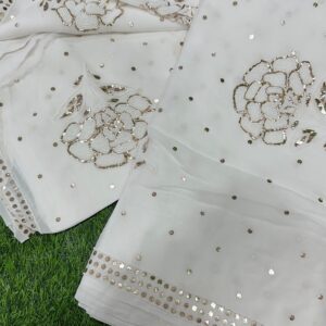 Mukesh work (also known as Badla work): Intricate hand embroidery done with fine metallic threads and flattened wires, adding shimmer and a regal look