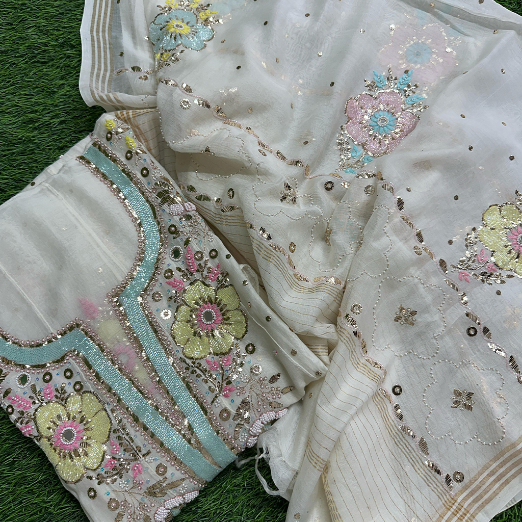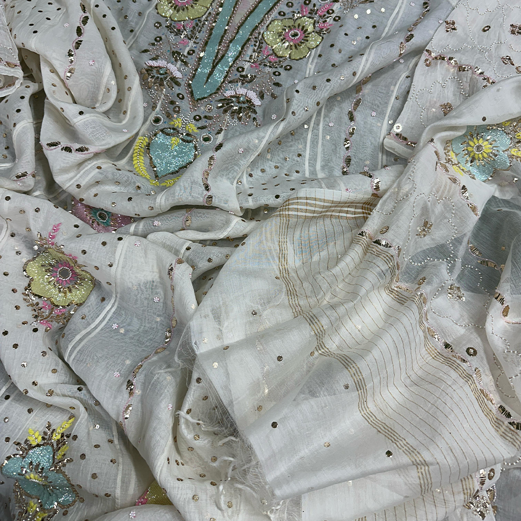 Add timeless elegance to your ethnic collection with this beautifully designed Chikan handwork Anarkali suit crafted from pure soft mul chanderi fabric. Known for its lightweight texture and subtle sheen, mul chanderi offers unmatched comfort while maintaining a rich traditional appeal.