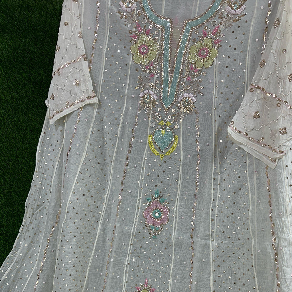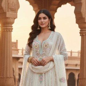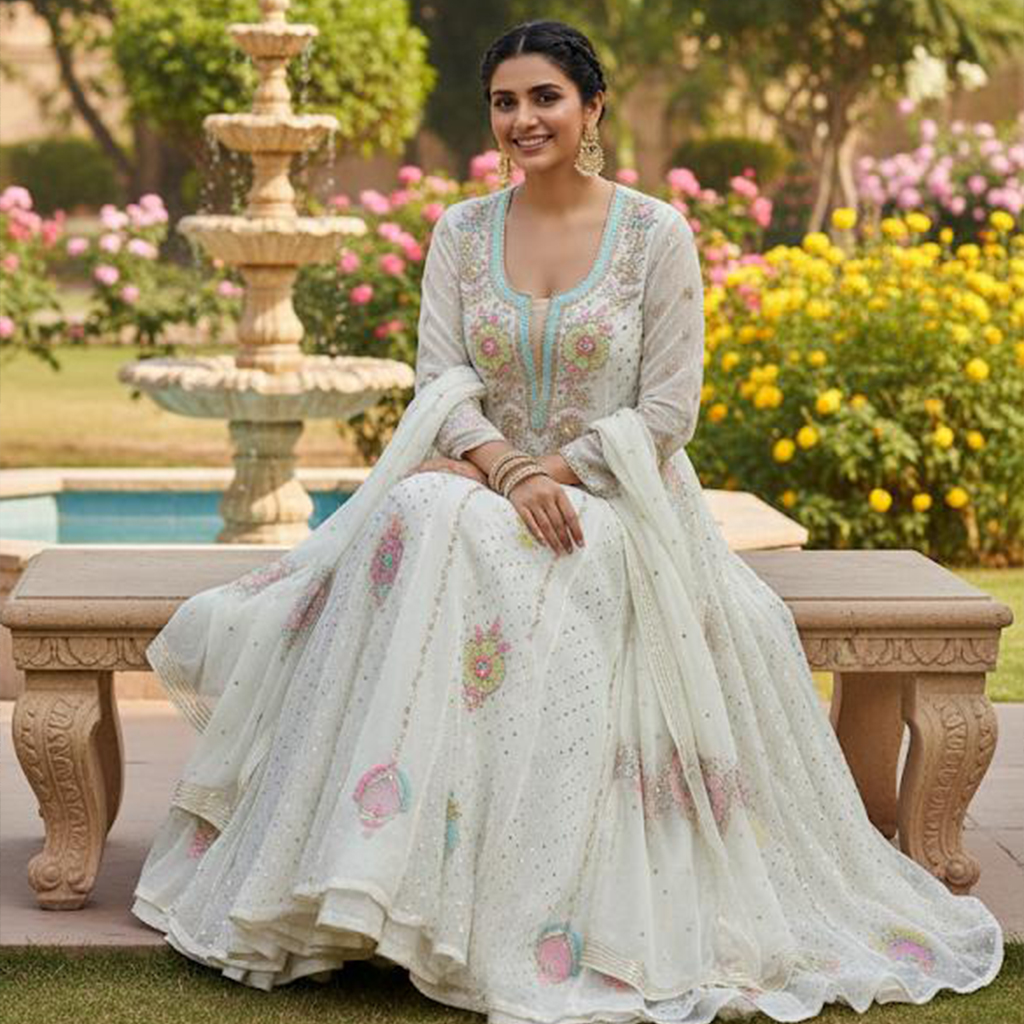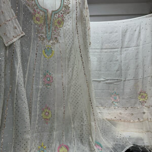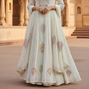 The intricate handcrafted Chikan embroidery is delicately placed across the Anarkali, enhanced with soft pastel floral motifs that elevate its grace and femininity. The full-length flared silhouette creates a royal and flowy look, making it perfect for festive occasions, weddings, and cultural celebrations.
