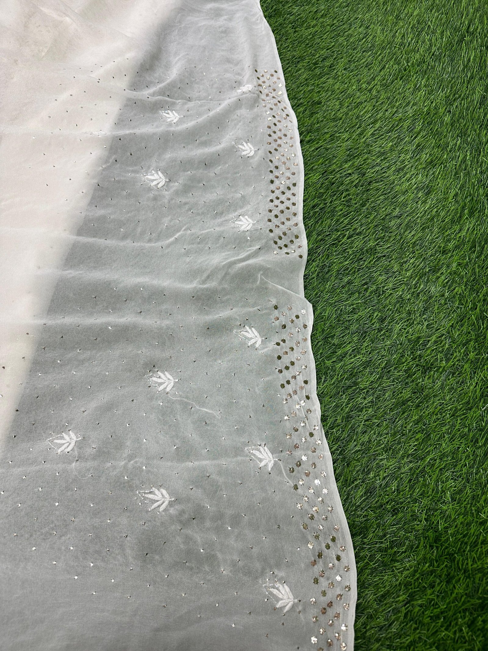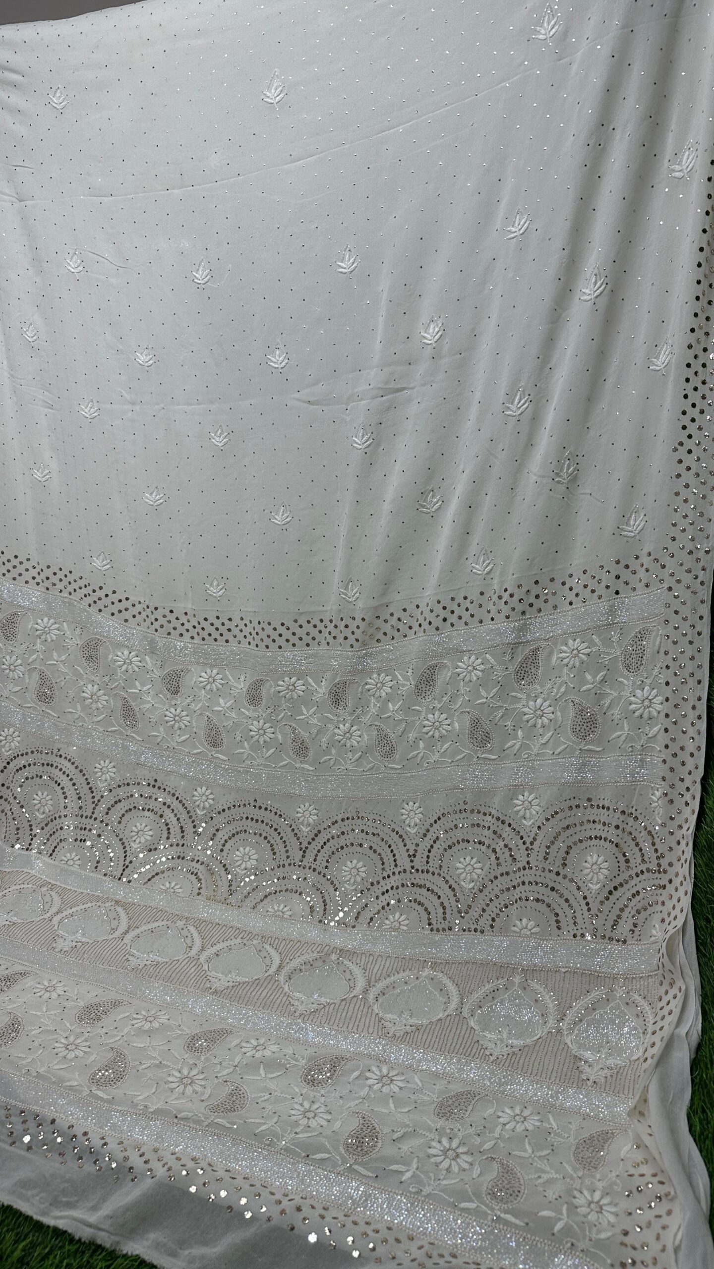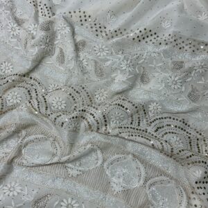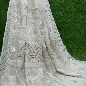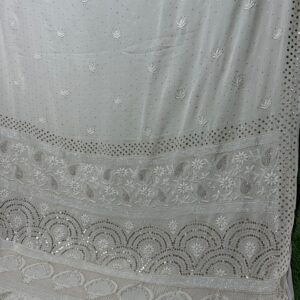 Soft pure georgette saree featuring exquisite Lucknowi Chikan embroidery, enhanced with Mukesh, Katdana, Teeki, pearl, and Pitta work.