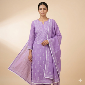 This design features beautifully spread Lucknowi Chikan embroidery in a refined pattern, enhanced with delicate Kurshiya work along the neckline and borders. The intricate detailing gives the outfit a sophisticated and timeless charm, while the evenly placed motifs add balance and elegance to the overall look.