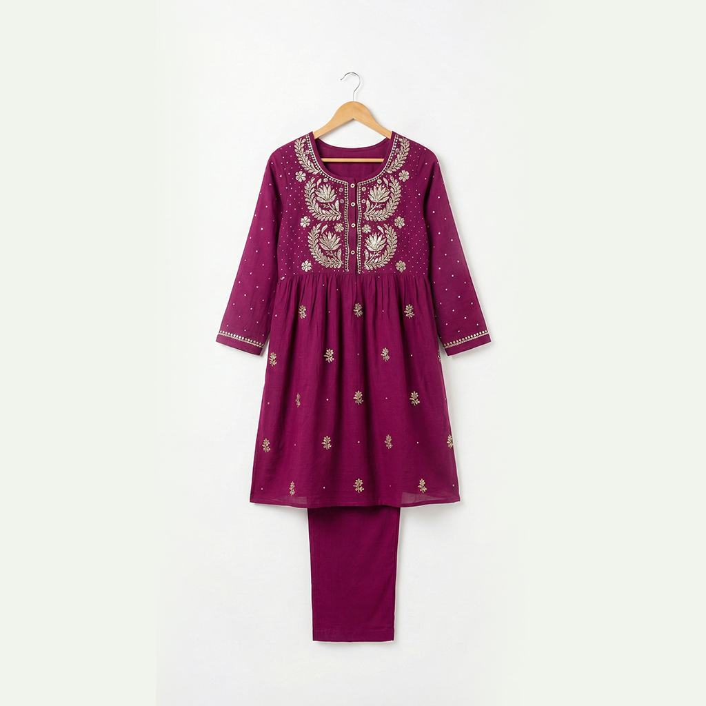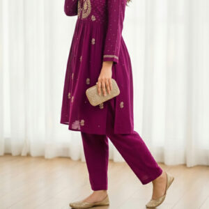 Bring timeless elegance to your ethnic collection with this stunning magenta kurta pant set. Designed with delicate floral embroidery inspired by traditional Lucknowi Chikan work, this outfit reflects classic Indian craftsmanship combined with modern comfort. The rich magenta tone enhances its festive appeal while the minimal yet graceful embroidery adds sophistication to the overall look.