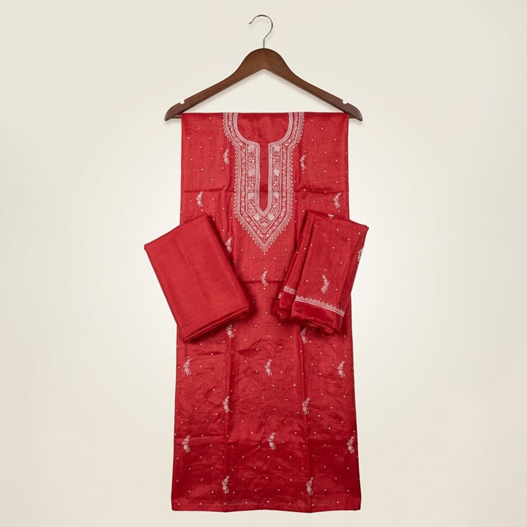 Graceful red Chikan embroidered unstitched kurta fabric set with matching bottom fabric and dupatta. Perfect for festive wear, casual elegance, and traditional occasions, allowing you to customize the outfit as per your style and fit.